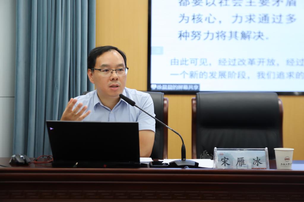 为迎接宣传党的二十大,坚定新生理想信念,厚植新生爱国爱党情怀,太阳集团网tyc9728于9月15日晚,线上线下同步开展新生主题教育系列活动之理想信念教育第一课。安徽省委讲师团办公室副主任宋雁冰受邀讲课,学院相关领导、辅导员、2022级全体新生参加活动。活动由学院党委副书记兼纪委书记鲍丽娟主持。