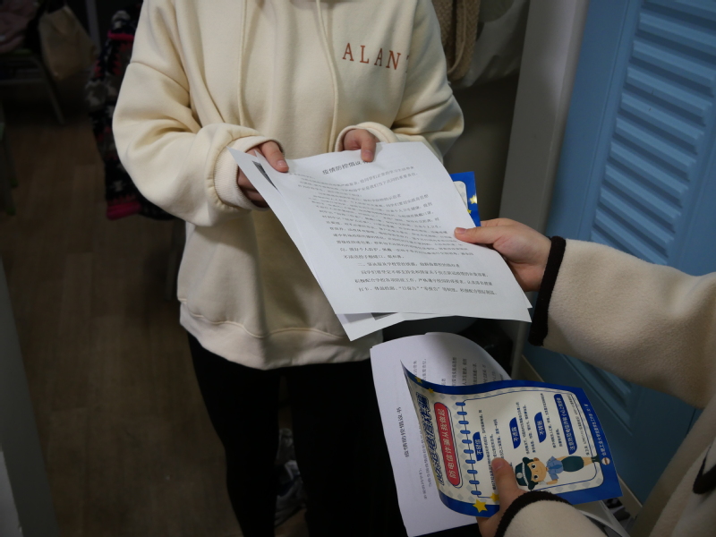 入户宣传“紧”起来。志愿者们深入宿舍、实验楼,进行科学防疫倡导,向同学们分发了防疫倡议书,倡导大家进行科学防疫,以乐观的心态面对疫情形势,不造谣、不传谣。“同学你好,请你一定要做好疫情防控工作,戴口罩、勤洗手、测体温、少聚集。”这是资环学院研究生党员志愿者在疫情防控宣传中进行防疫宣传的介绍,积极提醒各位同学注意日常防护,做好科学应对,引导广大研究生提高文明素质和自我防护意识。