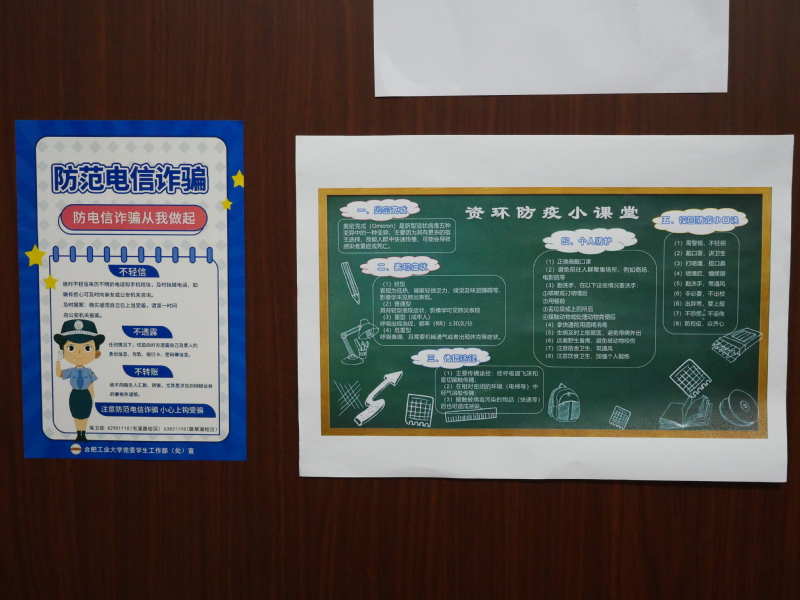 防疫知识“挂”起来。为了把疫情防控知识说得通俗易懂,让宣传内容入脑入心,资环学院研究生党支部将“资环防疫小课堂”等疫情防控知识、政策编写成活泼生动、通俗易懂的防疫宣传小知识,张贴在各个宿舍、实验室,时刻提醒广大研究生重视疫情,并真正将疫情防控政策等内容不间断地传递到手里、耳里、心里,形成全校防疫的强大合力。