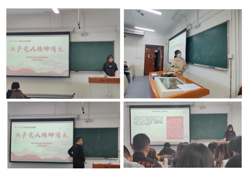 活动伊始,吴思琪同学做主题分享,在庆祝中国共产党成立100周年大会上,习近平总书记指出:“一百年来,中国共产党弘扬伟大建党精神,在长期奋斗中构建起中国共产党人的精神谱系,锤炼出鲜明的政治品格。”吴思琪同学介绍了百年党史四个历史时期的形成的精神内涵及鲜明特征,对井冈山精神、长征精神、延安精神、红岩精神、西柏坡精神、南泥湾精神、抗美援朝精神、“两弹一星”精神、雷锋精神、焦裕禄精神、特区精神、载人航天精神、脱贫攻坚精神、抗疫精神等伟大精神进行讲解。