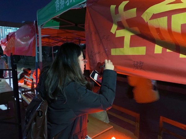 本次活动中,学员们自由组成小组,一部分学员组织路过的同学们参与相关游戏,加深对艾滋病的了解。其中一名学员身穿玩偶服装假扮艾滋患者,手持写着“假如我是一个艾滋病患者,你愿意给我一个拥抱吗?”字样的纸板,与同学们开展拥抱互动,呼吁同学们克服心理歧视,防艾不妨爱,平等对待艾滋病患者。另一部分学员则引导路过的同学们在签名墙上写下关于艾滋的寄语以及签名,并与之进行合影留念。