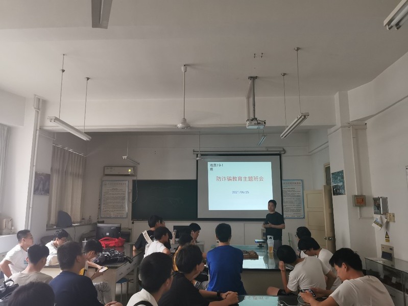 为提高当代大学生安全防范意识,6月25日,地质19-1班的班主任李龙明老师开展以“擦慧眼,防诈骗”为主题的班会。