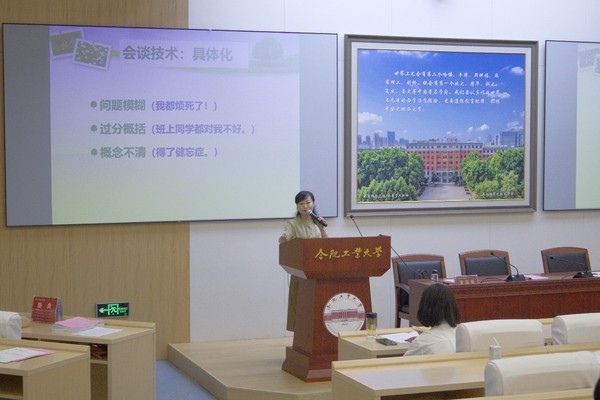 开幕式结束后,安庆师范大学心理学教授宋志英受邀开展《班主任工作中的心理会谈技术》的讲座。宋老师结合班主任工作实践,从沟通的态度和技巧两方面展开,详细介绍了专注、倾听、具体化、解释等会谈技术的具体操作方法,并通过案例示范,让大家明晰运用情境和方法。