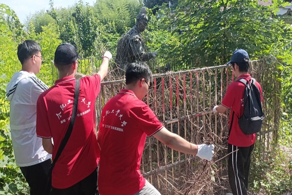 青年心事当拏云,振兴乡村勇担当。调研过程中,为了帮助村委会解决发展过程中的相关问题,团队成员还携带剪刀、铲子等工具来到观北生态园,对阻碍通行、影响美观的杂草进行修剪,并清理雕像上枯萎的枝条,美化生态园环境;利用电商平台通过网络直播对晨光村酒进行宣传,向外界展示晨光村酒的独特魅力,帮助晨光村推销村酒。