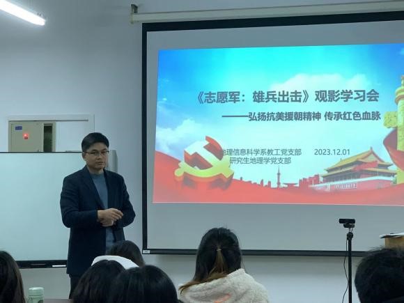 回首来时路,砥砺再前行。为致敬英烈、铭记历史,11月29日下午,地理信息科学系教工党支部、研究生地理学党支部、2021级研究生地理学与地工党支部开展联合共建活动,组织师生观看电影《志愿军:雄兵出击》,教工支部及学生支部党员、学生支部入党积极分子共同参加。