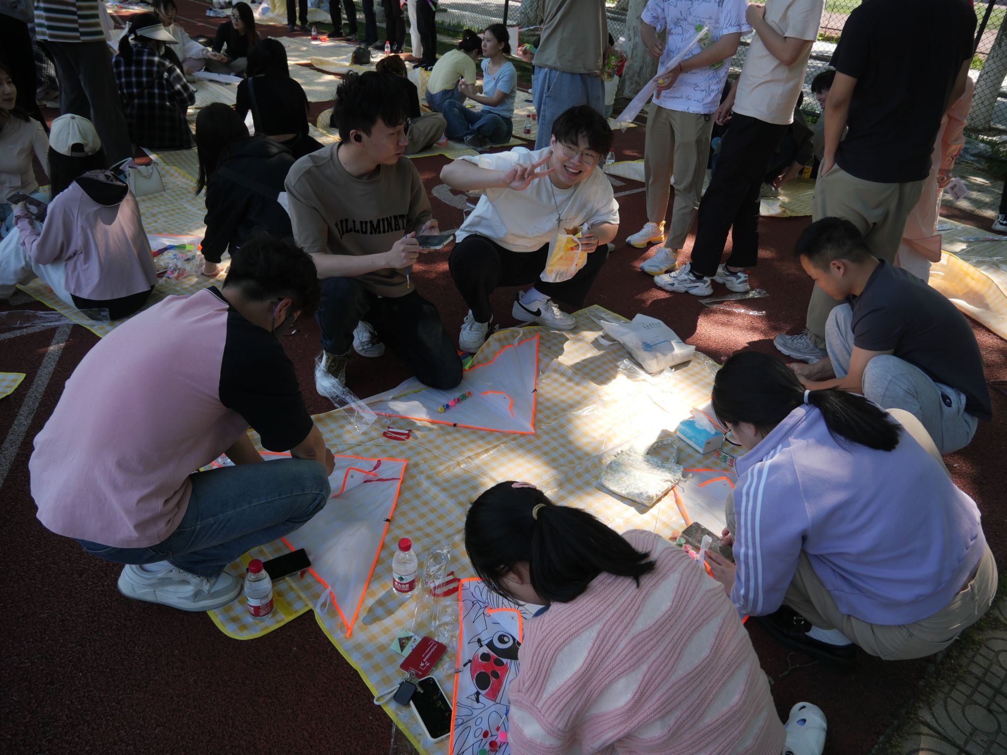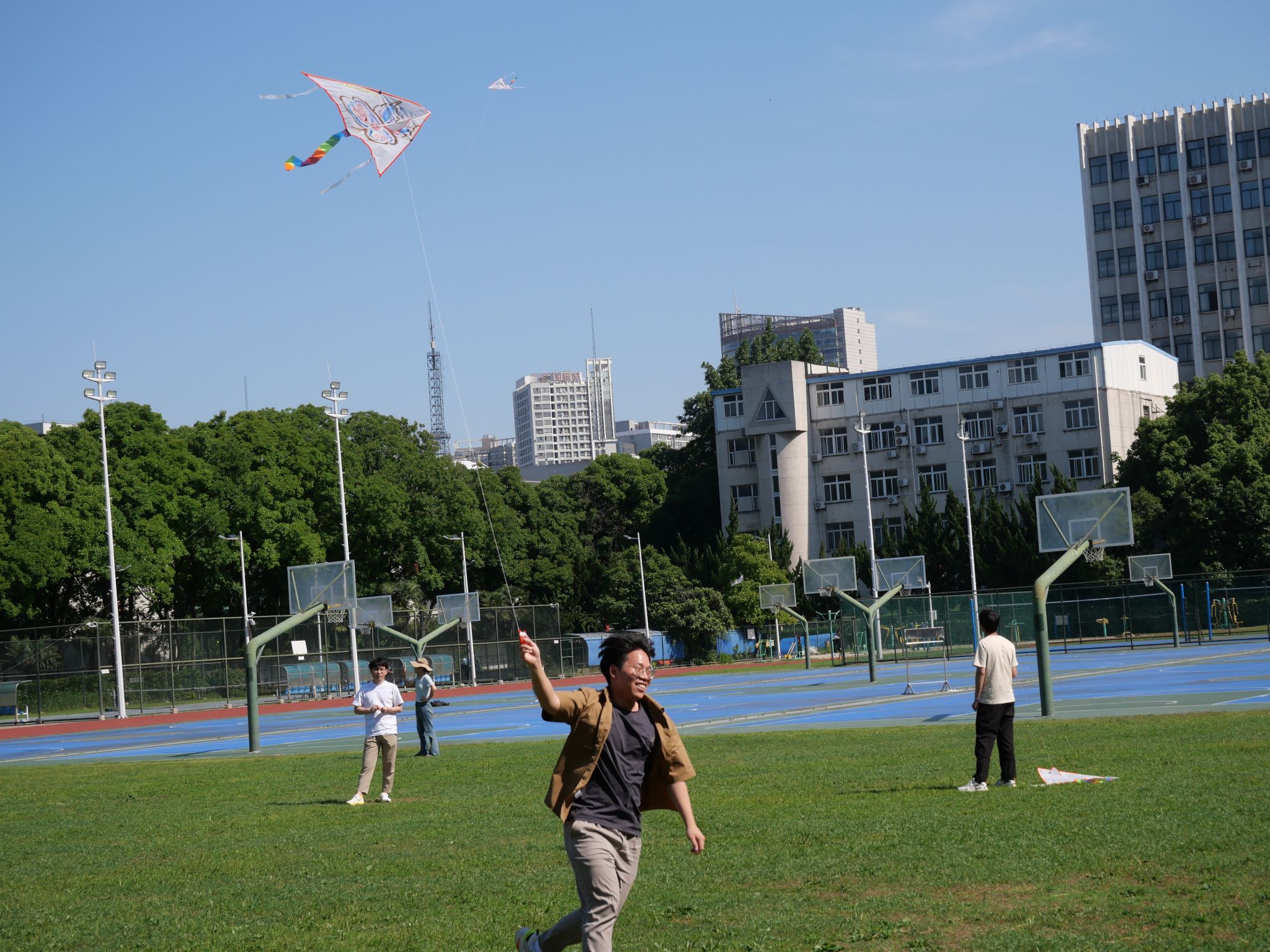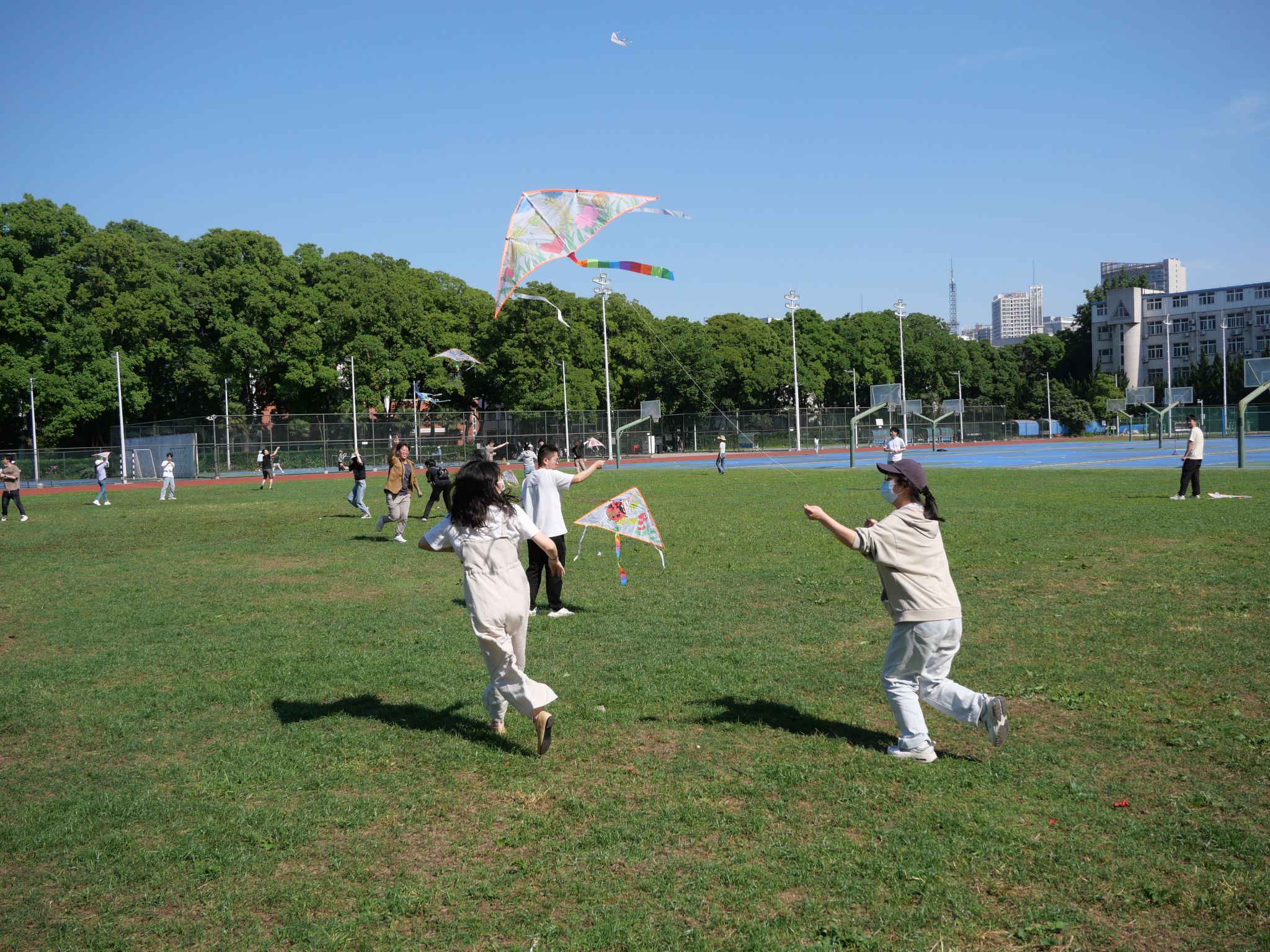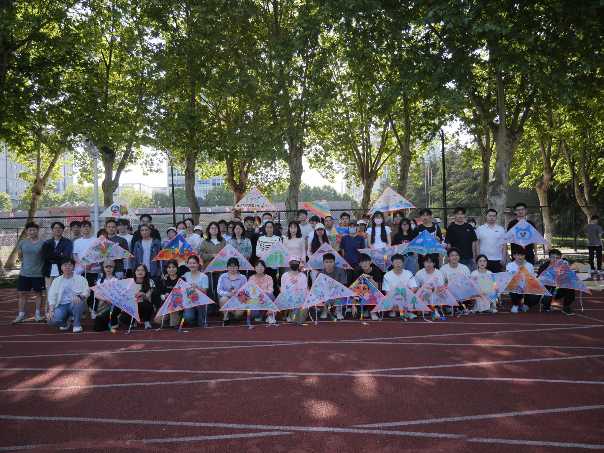 活动现场,老师同学们按照预先的分组井然有序地进行签到并领取相关材料。大家围坐于操场树荫下,挥毫舞墨,在尚未着色的风筝上绘制心中的图案。有的展现自然美景,有的勾勒卡通形象,有的述说学习感悟。涂鸦的过程充满欢声笑语,师生相互交流、共同努力,五颜六色的风筝陆续出现在大家手中。涂鸦完成后,便是令人期待的风筝放飞环节。放眼望去,草坪上同学们在奋力奔跑,天空中各式各样的风筝在乘风翱翔,它们互比高低,都在向着蓝天,向着白云,向着未来展翅飞翔。