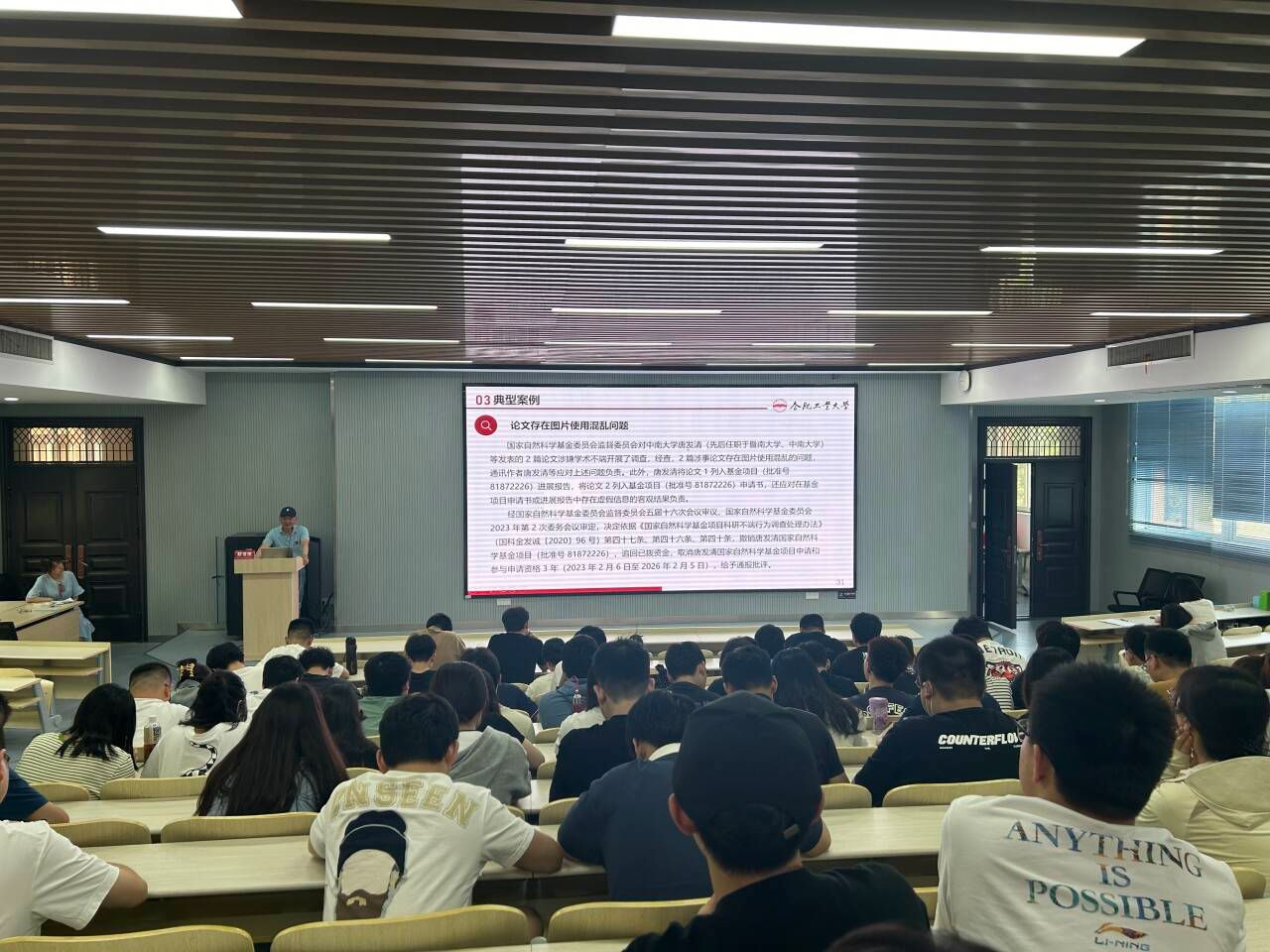 讲座中,彭老师深入浅出地阐述了学术诚信的内涵、重要性和必要性。他结合《高等学校预防与处理学术不端行为办法》,详细介绍了剽窃、伪造、篡改等典型学术不端行为的界定准则,并通过详实案例解释了学术不端行为的核心判据。他强调,学术诚信是学术研究的基石,是每一位科研工作者必须坚守的学术道德底线。他号召同学们,要“从我做起,从现在做起”,脚踏实地做研究。在互动环节,彭书传耐心解答了同学们的提问。他以自身经历勉励在座同学,要继承弘扬工大严谨治学的优良传统,做到自信自强、守正创新、勇攀高峰,为科技强国建设贡献工大学子的青春力量。