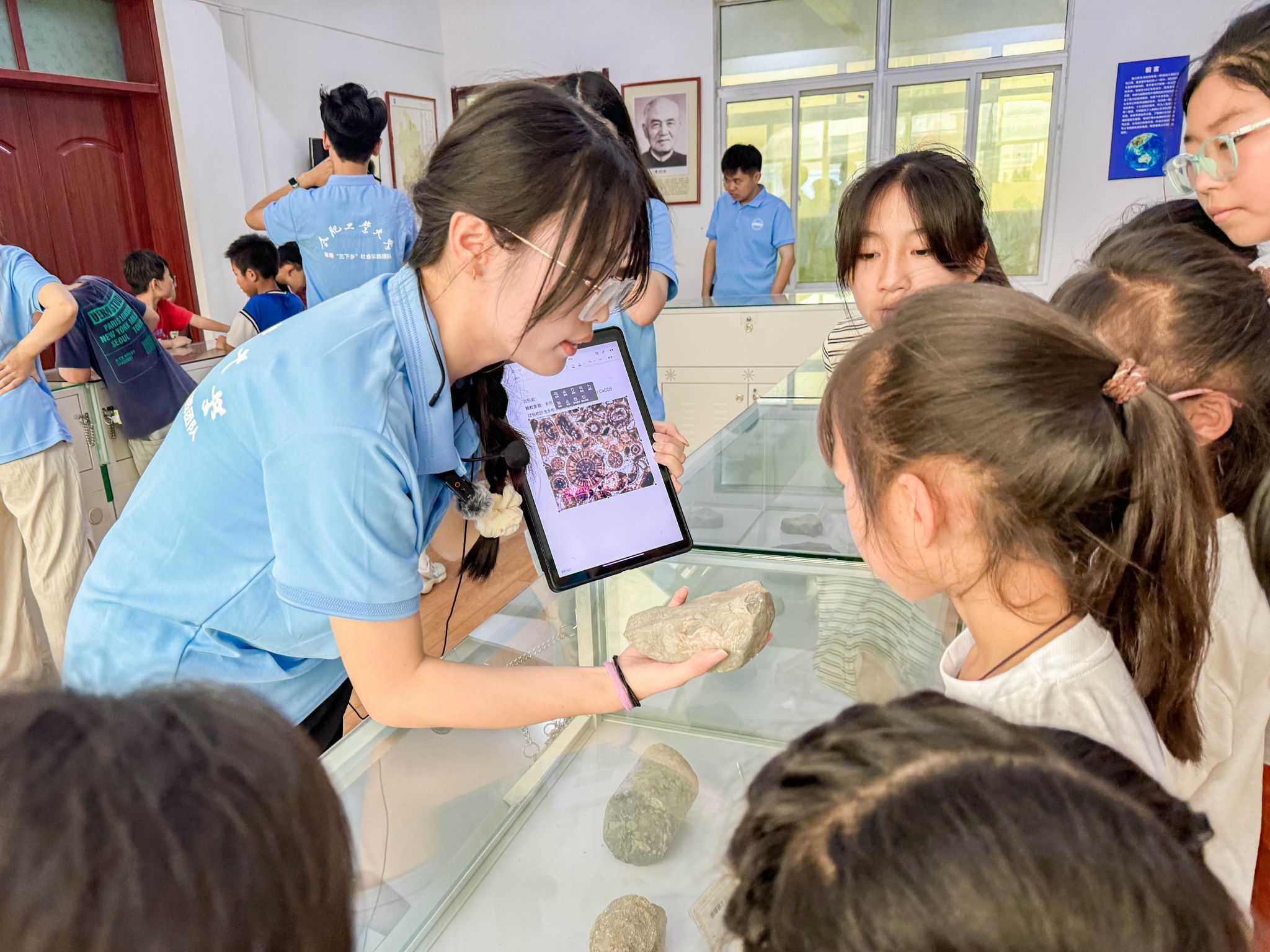 心系留守儿童,致力乡村教育。7月13日,团队来到灵璧县砂坝村,为村中留守儿童带来科普教育。团队成员从化石,矿物,岩石以及地貌四个方面带领小朋友们了解地球奥秘,通过小实验、标本展示等方式,让小朋友们更加直观理解地质科学知识,并带领小朋友参观地球科普展览馆,通过实物讲解,使小朋友们感受地学乐趣,激发学习热情。
